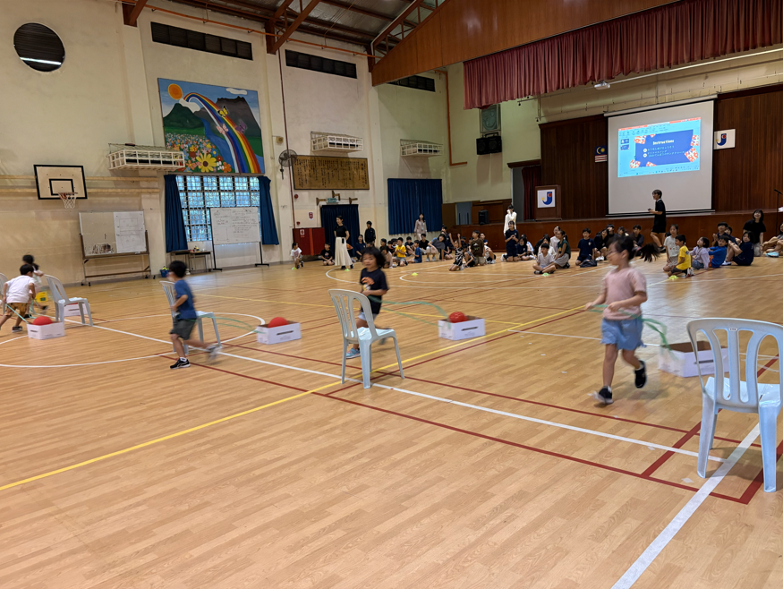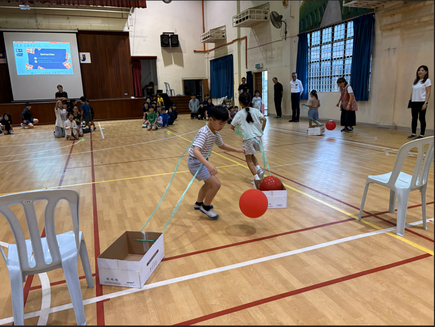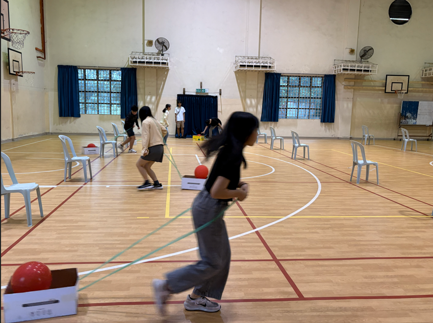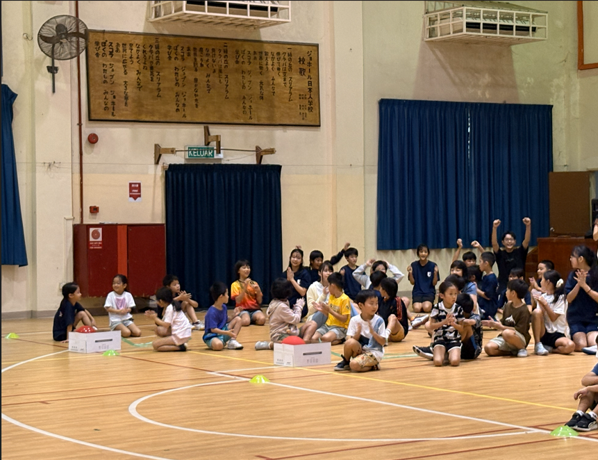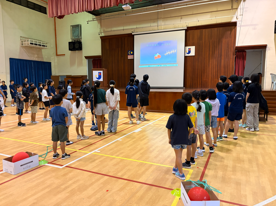 文化委員会主催のクリスマス集会では、プレゼント運び競走とクリスマスソングを全校で歌うことをしました。プレゼントに見立てた風船はとても軽く、走るとコロコロ転がって箱から出ていってしまいます。みんな、なんどもプレゼントを落としたりもどしたりながらリレーをしていました。中には、慌てずに歩いて運んだり、プレゼントを見ながら後ろ向きで走ったりと、工夫している子もいました。今年最後の縦割りでの活動は、クリスマス感のある、とても楽しいイベントで盛り上がりました。